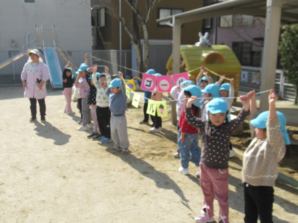 「今日もいっぱい走るぞ!」と、毎日続けていたかけ足。この日は、なんと…磯辺小学校の兄さん姉さんが来てくれ一緒に走りました。