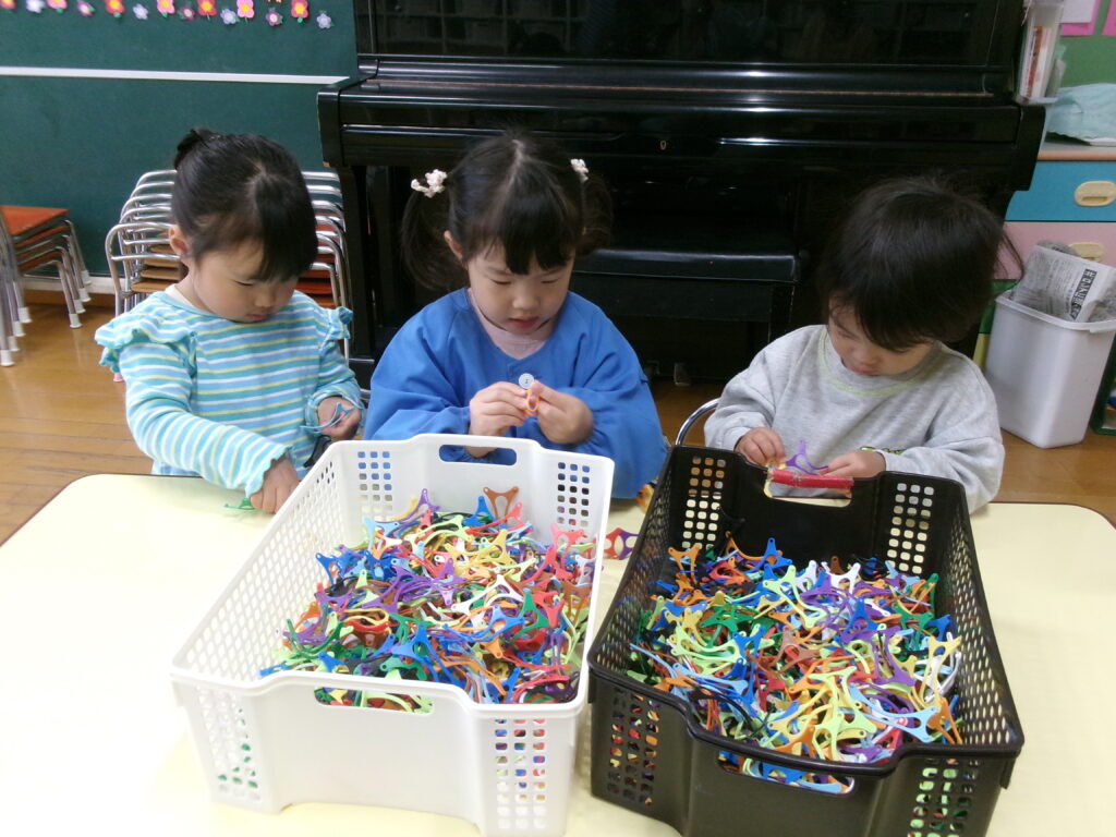ワミーを繋げて、ボールやブレスレットなど様々な物を作っています!「今日は何を作ってみようかな?」と楽しむ子ども達です♪