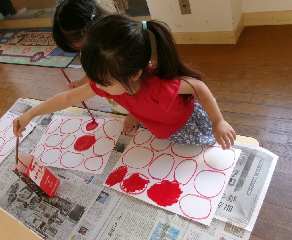 クレヨンでかいた丸の中に絵の具で色を塗りました。「まだぬっていい?」「たのしい!」と塗っていました。