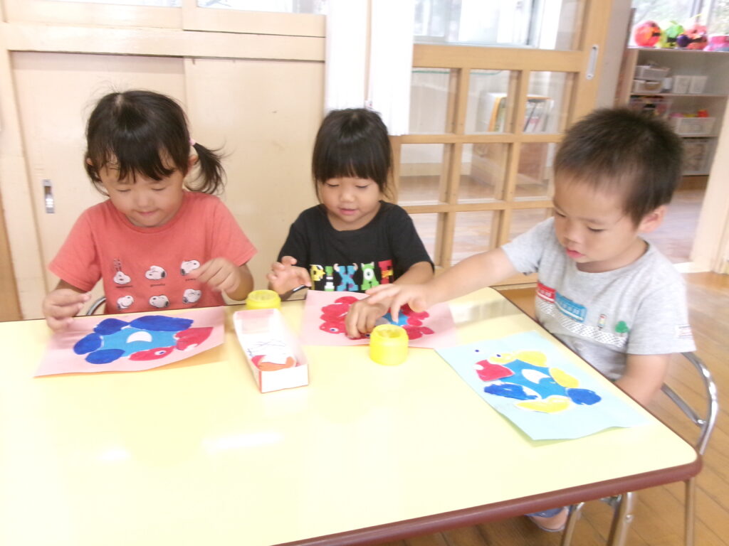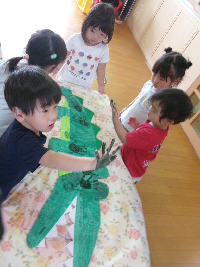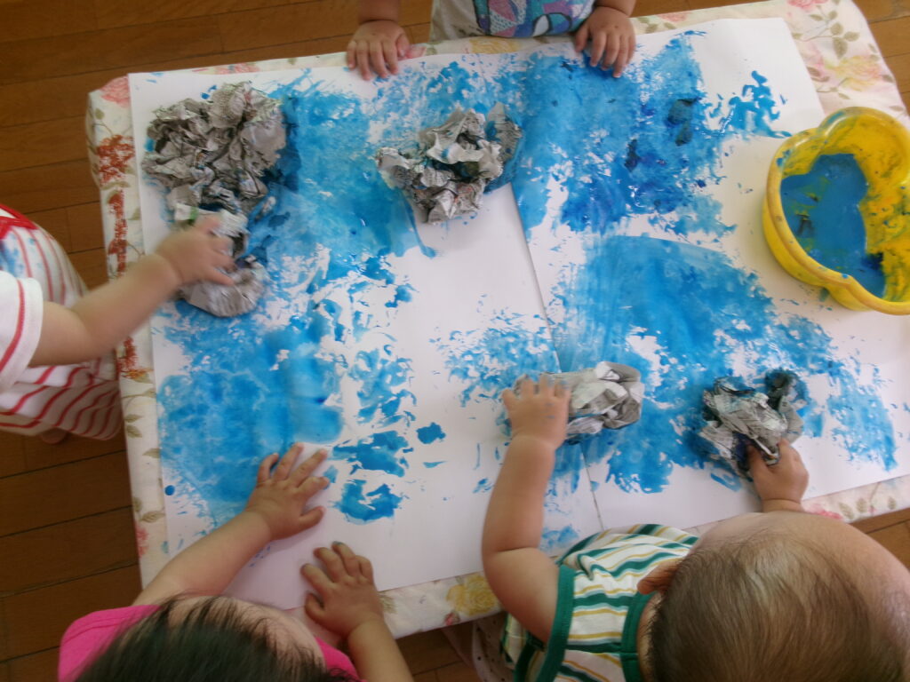 絵の具遊びで大きな紙にペタペタ・・・