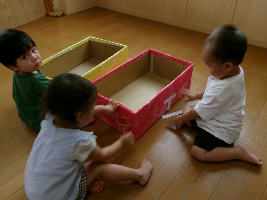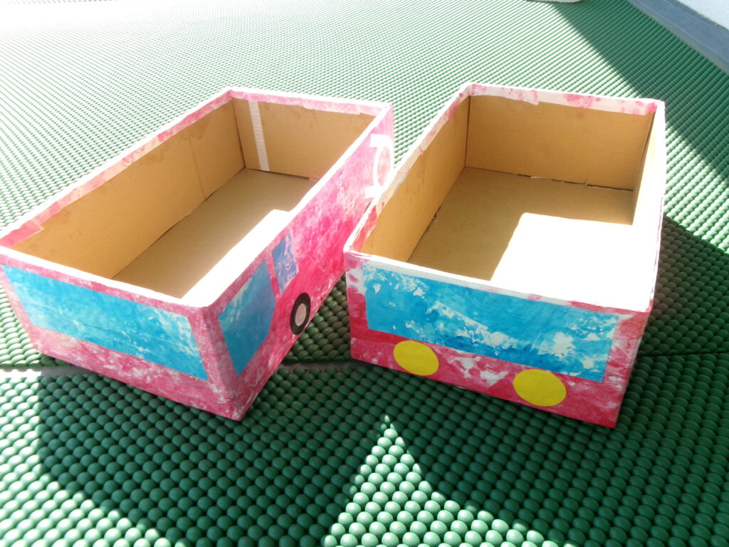 子ども達が色付けした大きな紙が、乗り物に変身!
