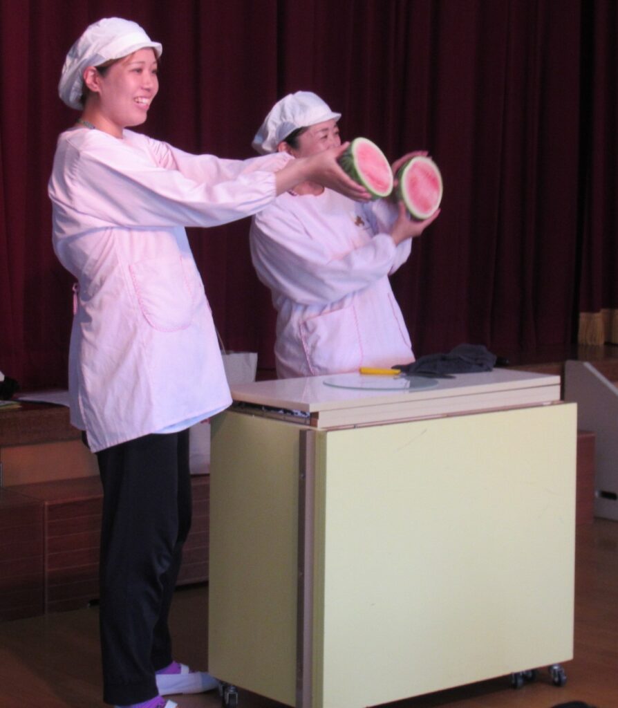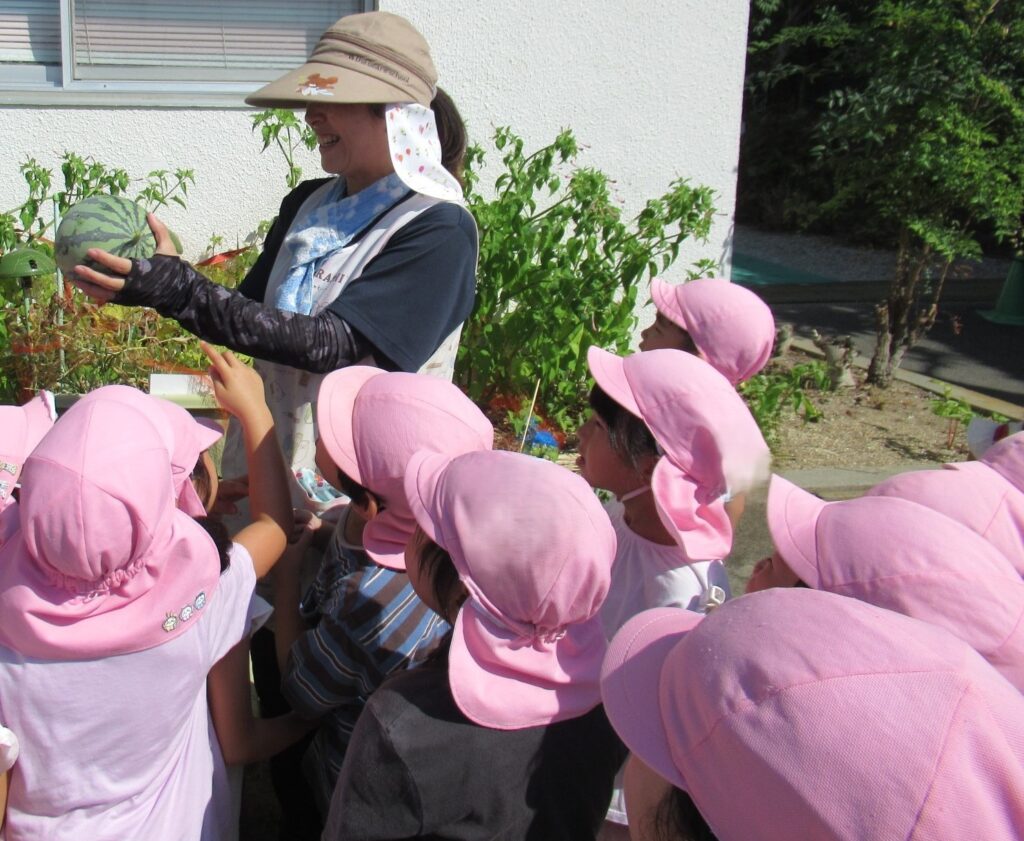 年長児が育てたスイカの収穫をし、切ってみました☆