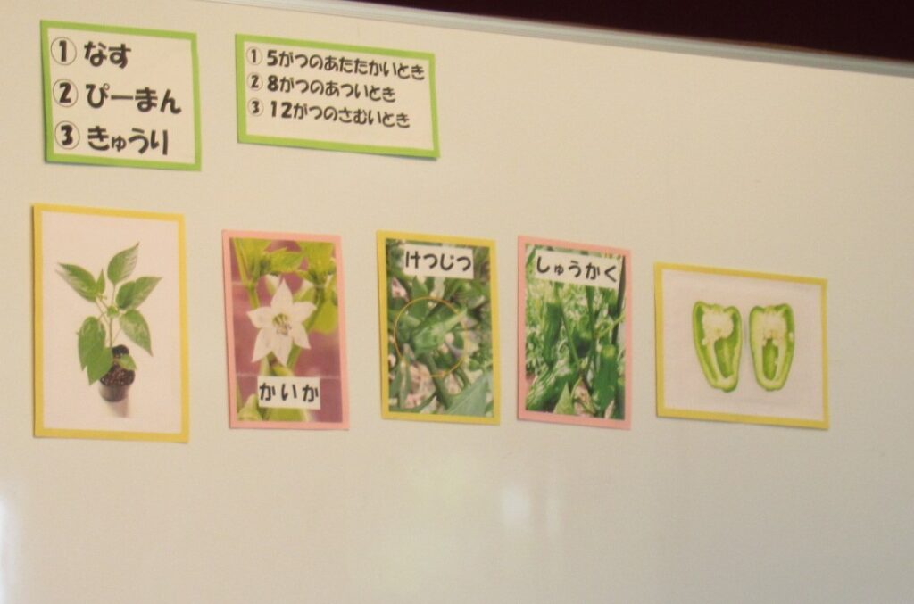年長児が育てた夏野菜の中からピーマンの生長の様子を