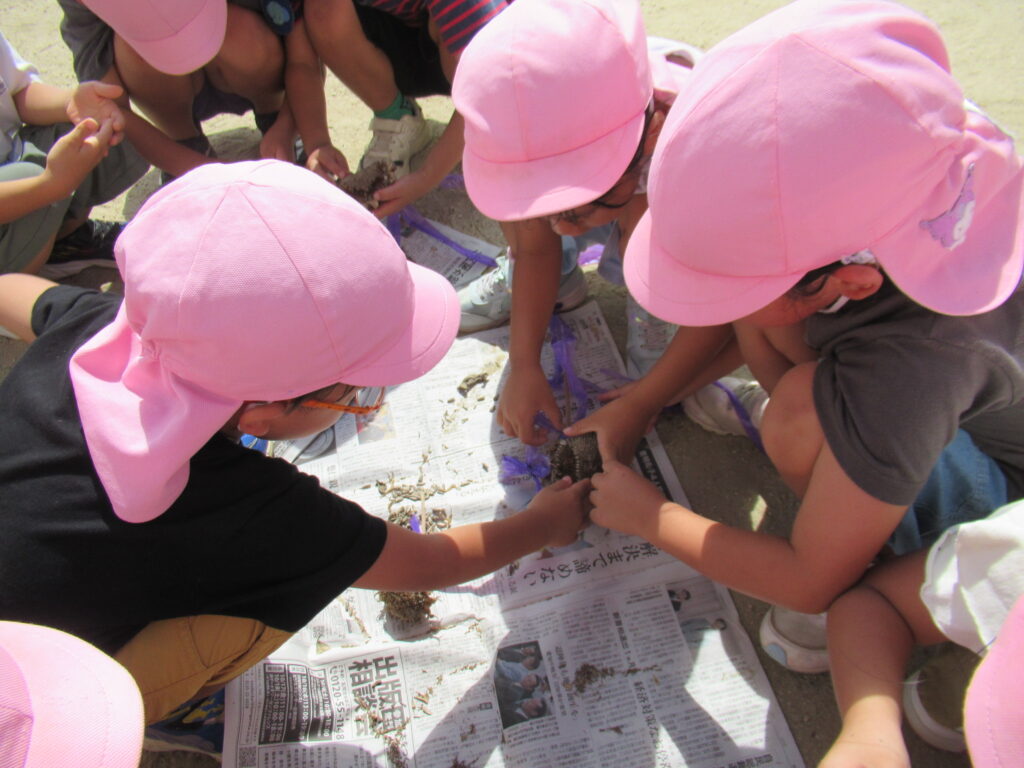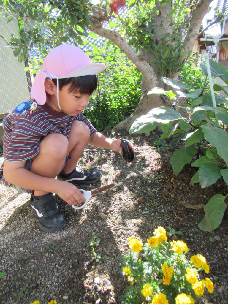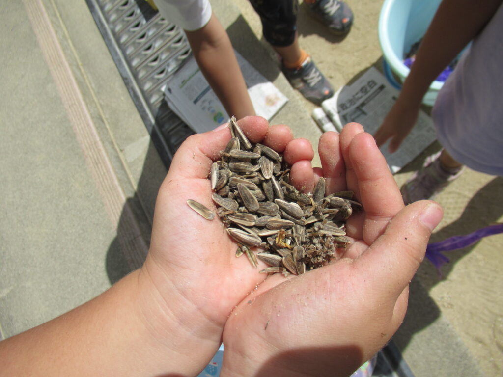 「また植えるとひまわりが咲くよね」「ハムスターってひまわりの種が好きなんだよ」と友達と会話を楽しみながら、とる姿がみられました。