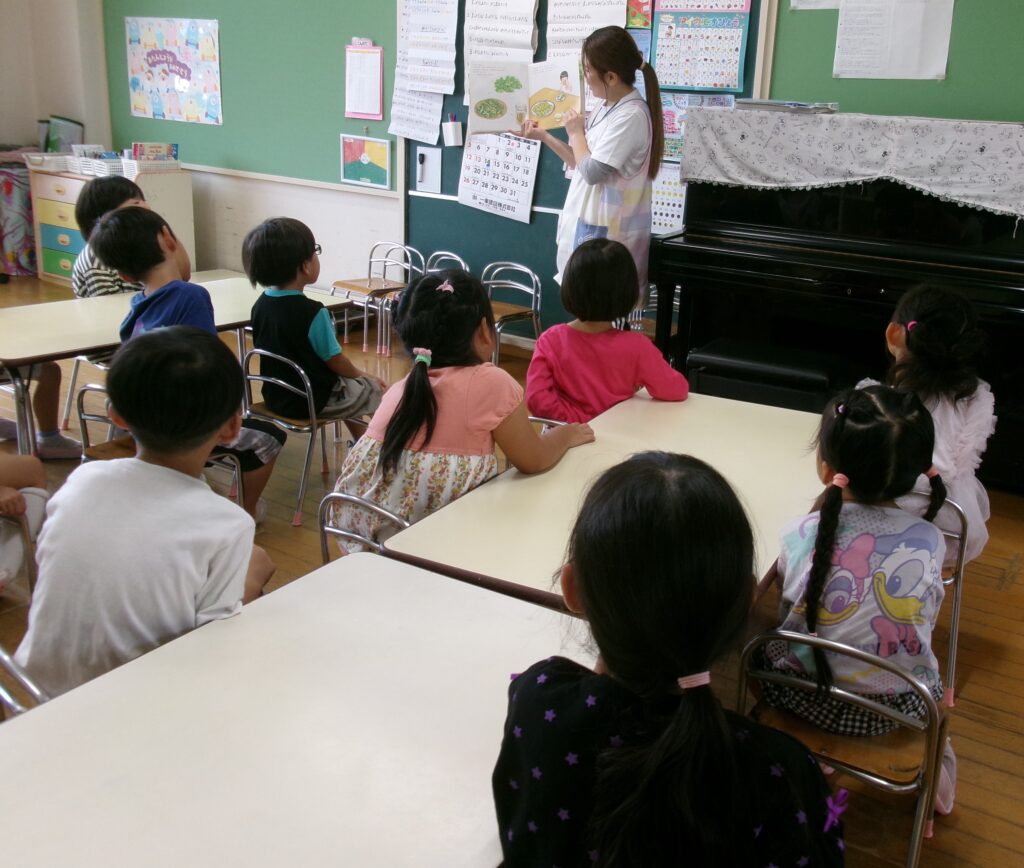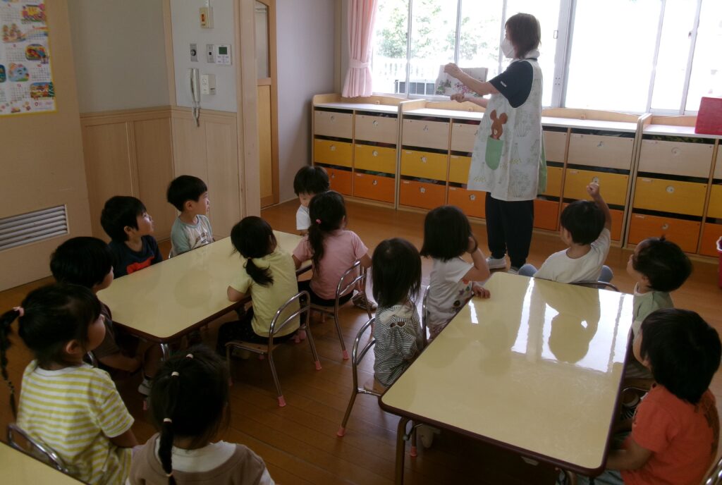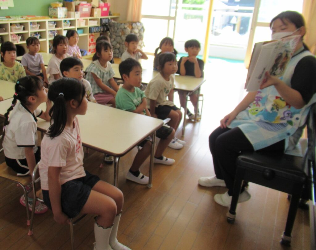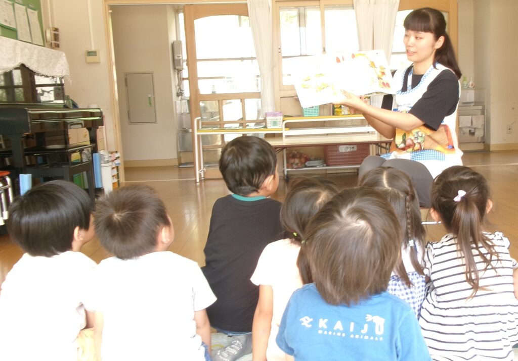 毎月行なわれている読み聞かせ。子ども達は「今日の先生はだれかな?」や「何の絵本読んでくれる?」と楽しみにしています。季節の絵本や子ども達の興味に合わせた話を毎回楽しんでいます。