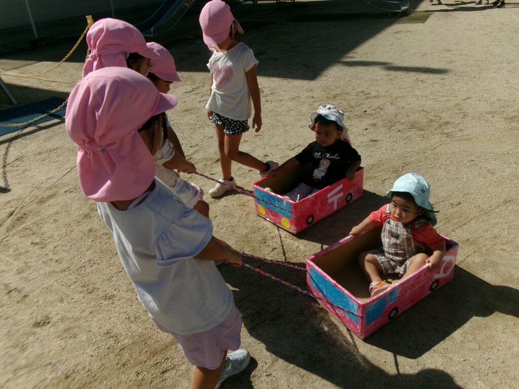 消防車、郵便車、ブルトーザーなどの乗り物に乗り、年長児のお姉さんが優しくリード、園庭を散歩して楽しんでいます。