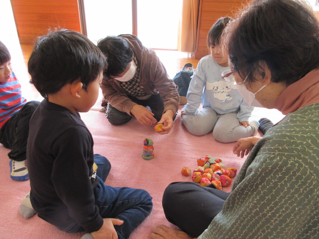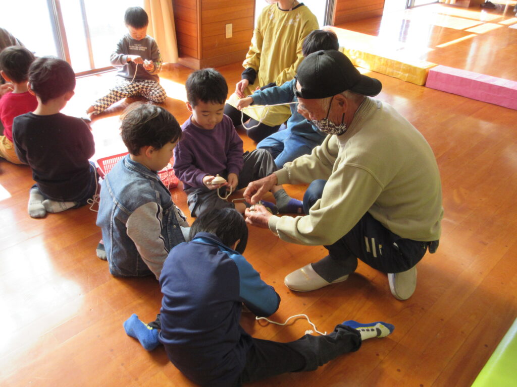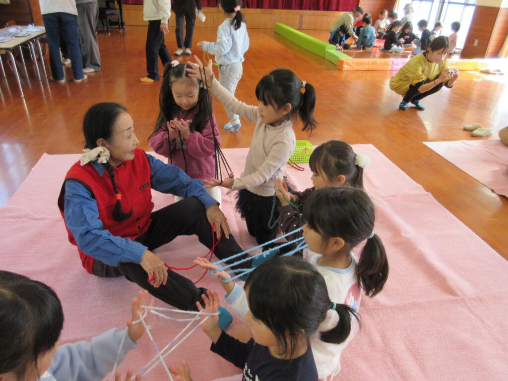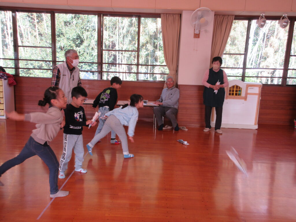 杉山校区老人会の方との交流で年長ゆり組が、昔ながらの伝承遊びを楽しみました。おてだまや紙飛行機、おはじきあやとり、こまなどに興味津々👀