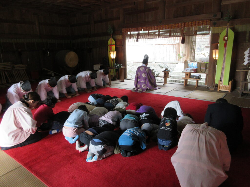 年長児は拝殿の中に入り、初めての長い正座を体験!