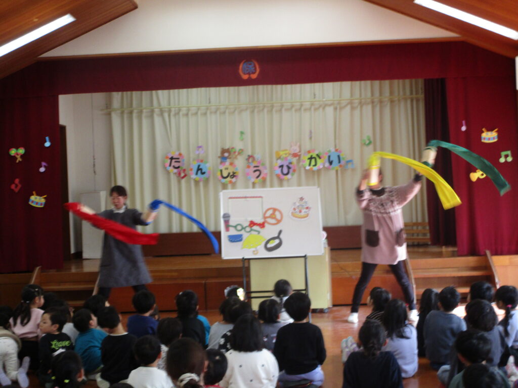今月の誕生会のお楽しみは『へんしんクレヨン』クレヨンで描いたものでおしゃれに変身していく゛ちかちゃん(5歳)゛「次は何がでてくるかな」「赤色がいい!」と大盛り上がりでした。最後は『どんないろがすき』の歌をみんなで歌って楽しみました。