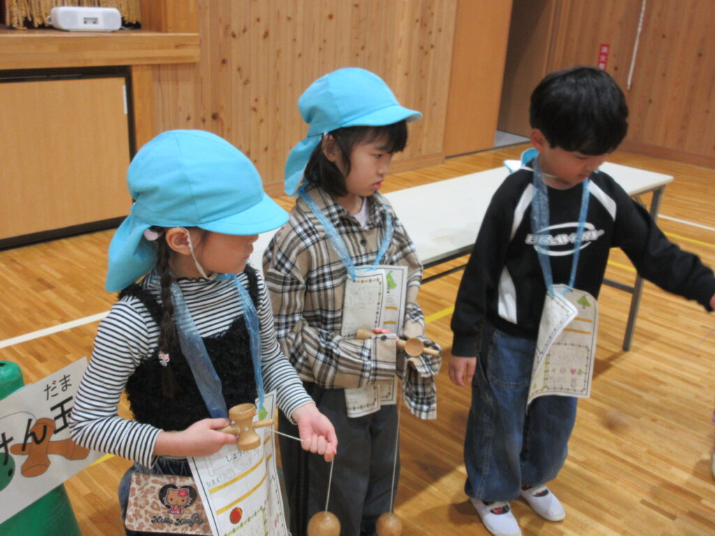 やり方を教えてもらいながら、けん玉、ボーリング、おはじき、めんこ、輪投げ、お手玉を一年生の子たちと一緒に遊びました。