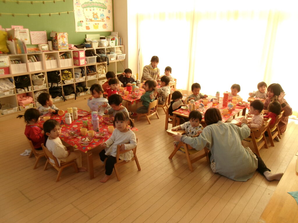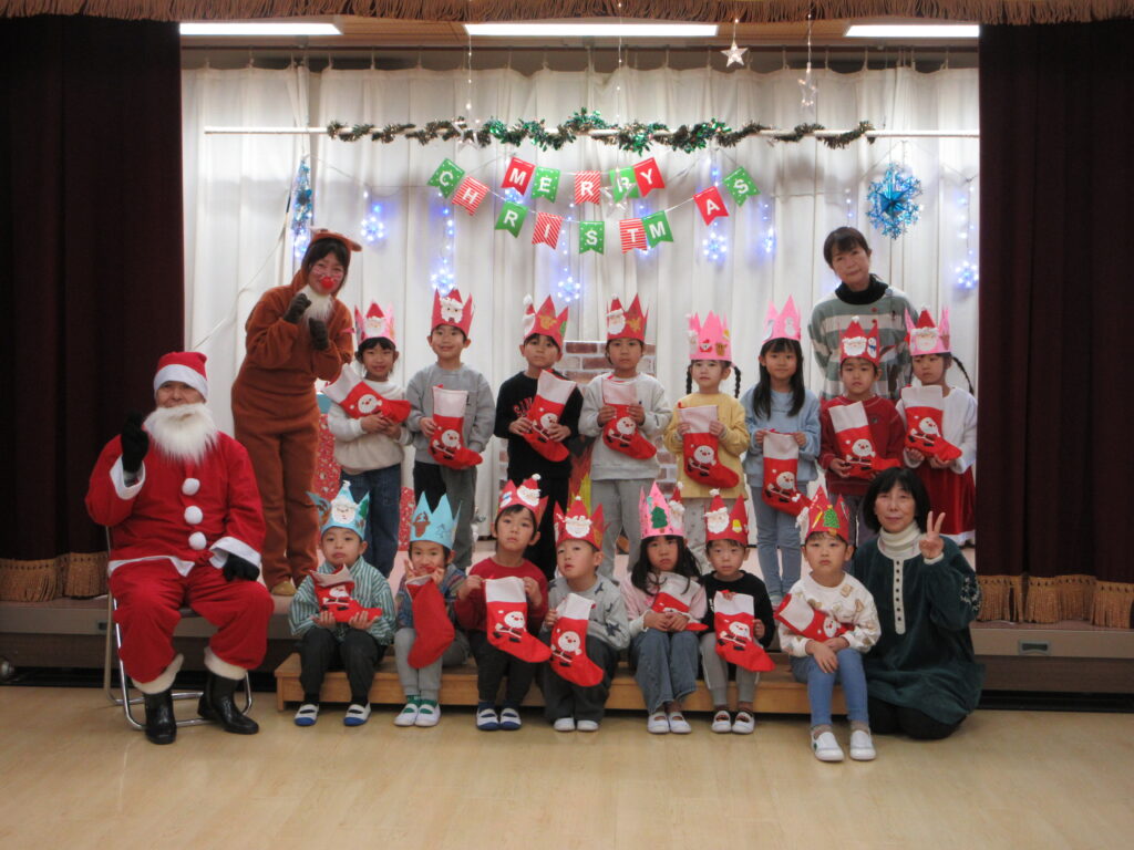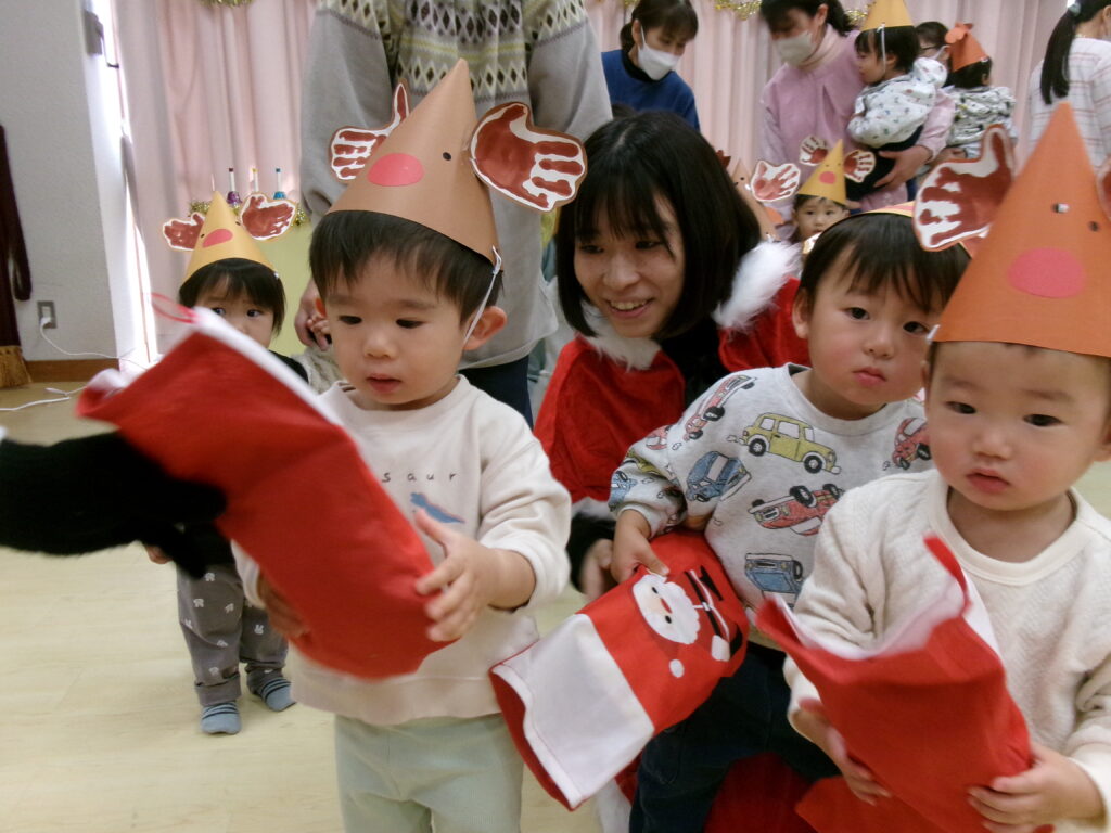 子どもたちが楽しみにしていたクリスマス会がありました♪サンタさんの登場に大喜び!ジングルベルのフォークダンスを踊ったり、サンタさんと一緒にハンドベル・フルートの演奏や劇を楽しみました。おやつは、スイートポテト!生クリームと飾りをつけると、「かわいい♡」と言って美味しそうにパクパクと食べていました♪
