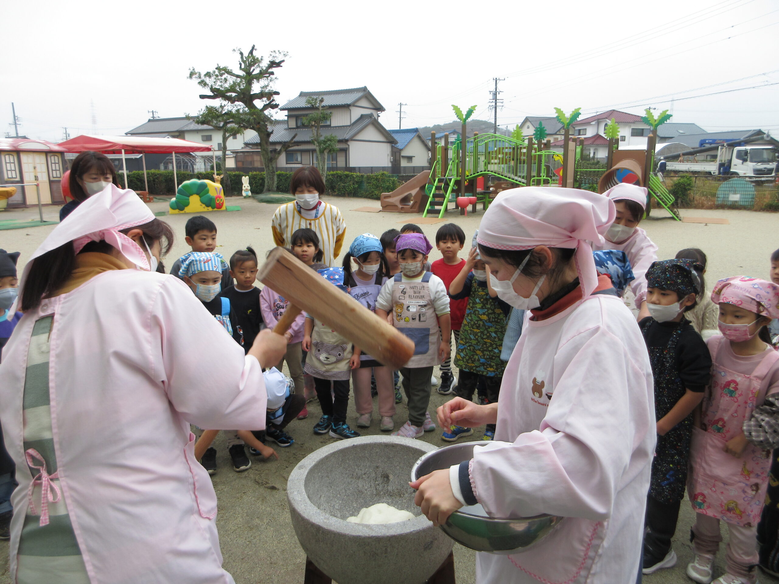 「よいしょー!」とみんなでかけ声をして力いっぱいつきました。